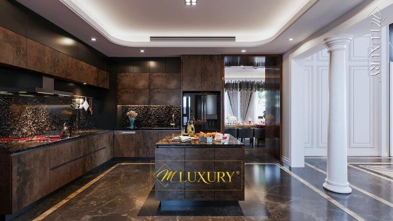 Mẫu tủ bếp gỗ tự nhiên màu nâu trầm sang trọng và cao cấp cho không gian phòng bếp biệt thự